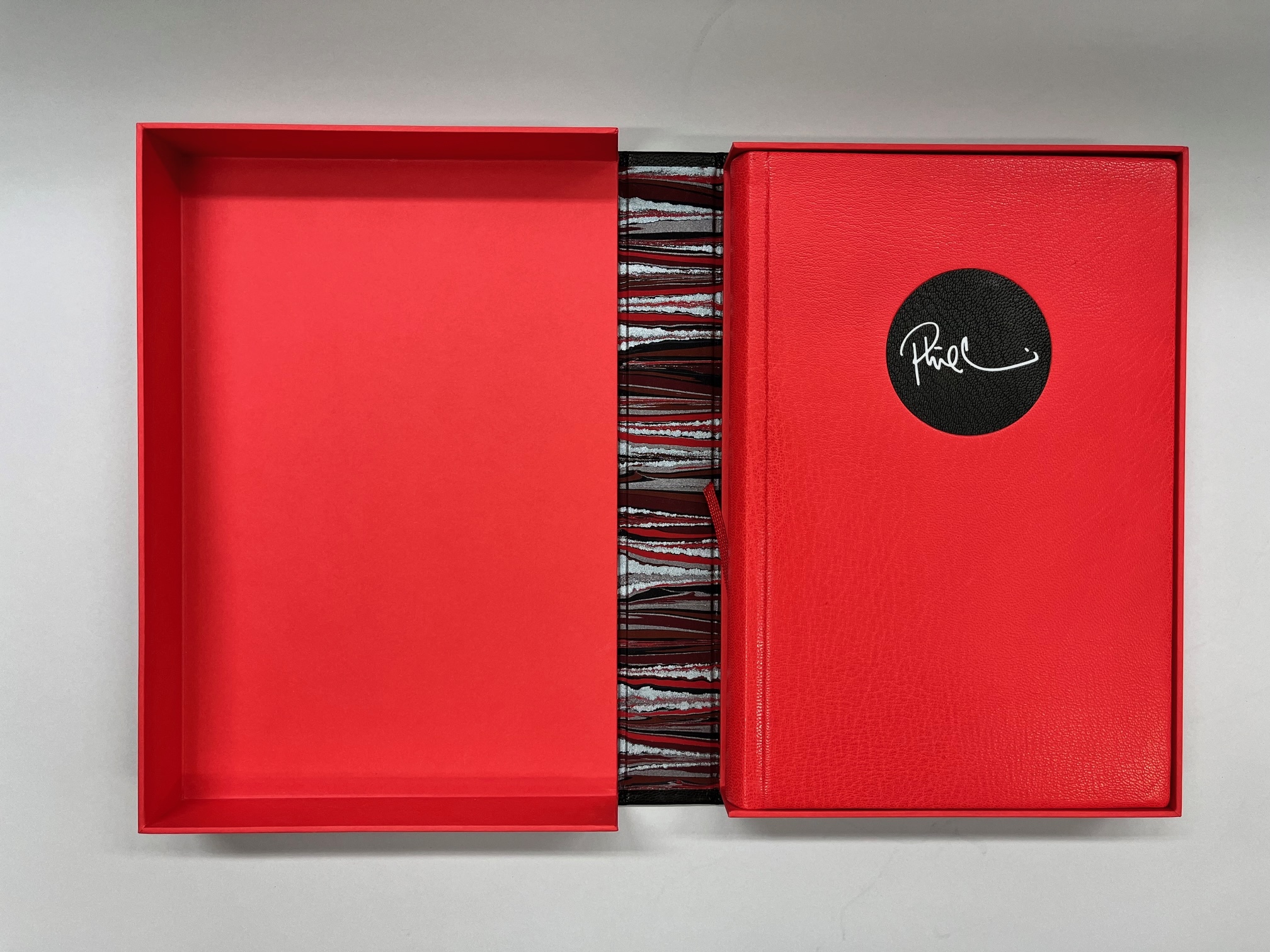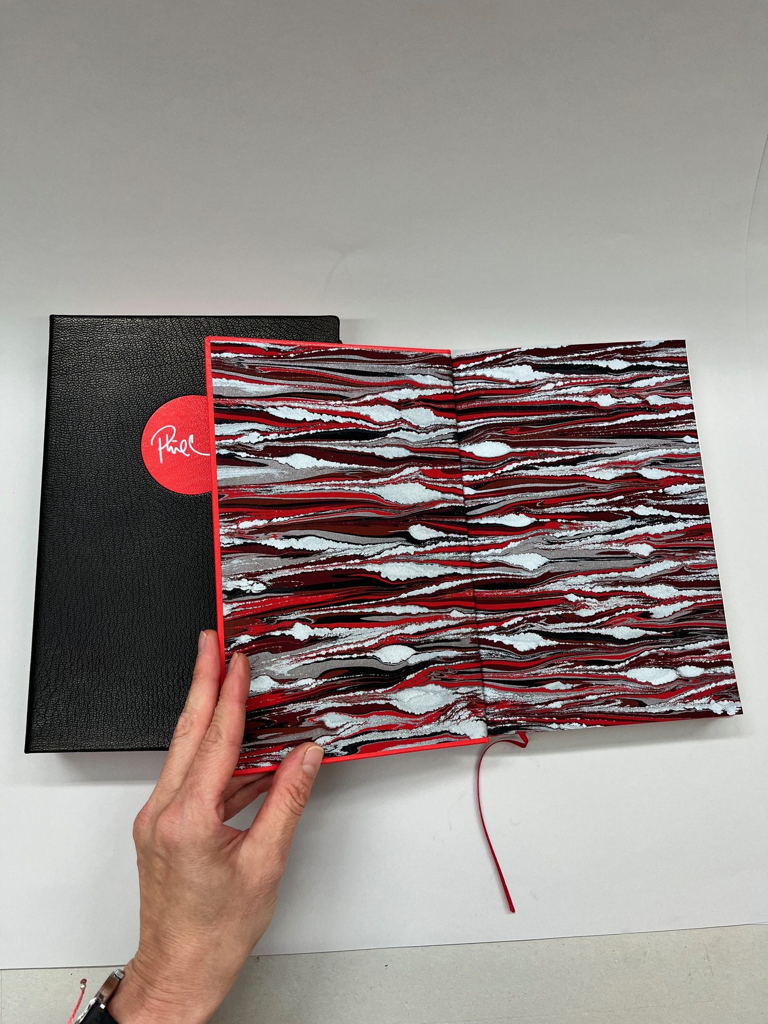 Gästebuch / Auflage: 1 / Format: 30 x 21 cm / Material: Rindleder schwarz, Papier rot und gold
