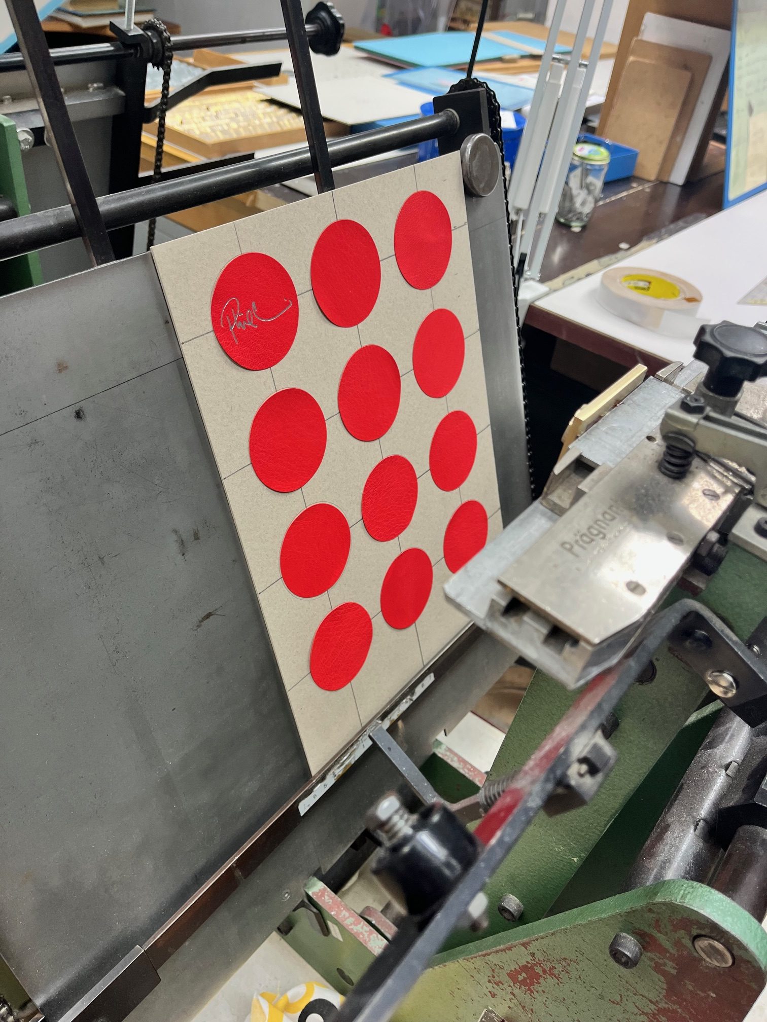 Auflage: 10 / Format: 34 cm x 44 cm / Kassette aus Vollpappe mit Papier bezogen / Einsatz aus Hartschaum / Prägung von Klischees