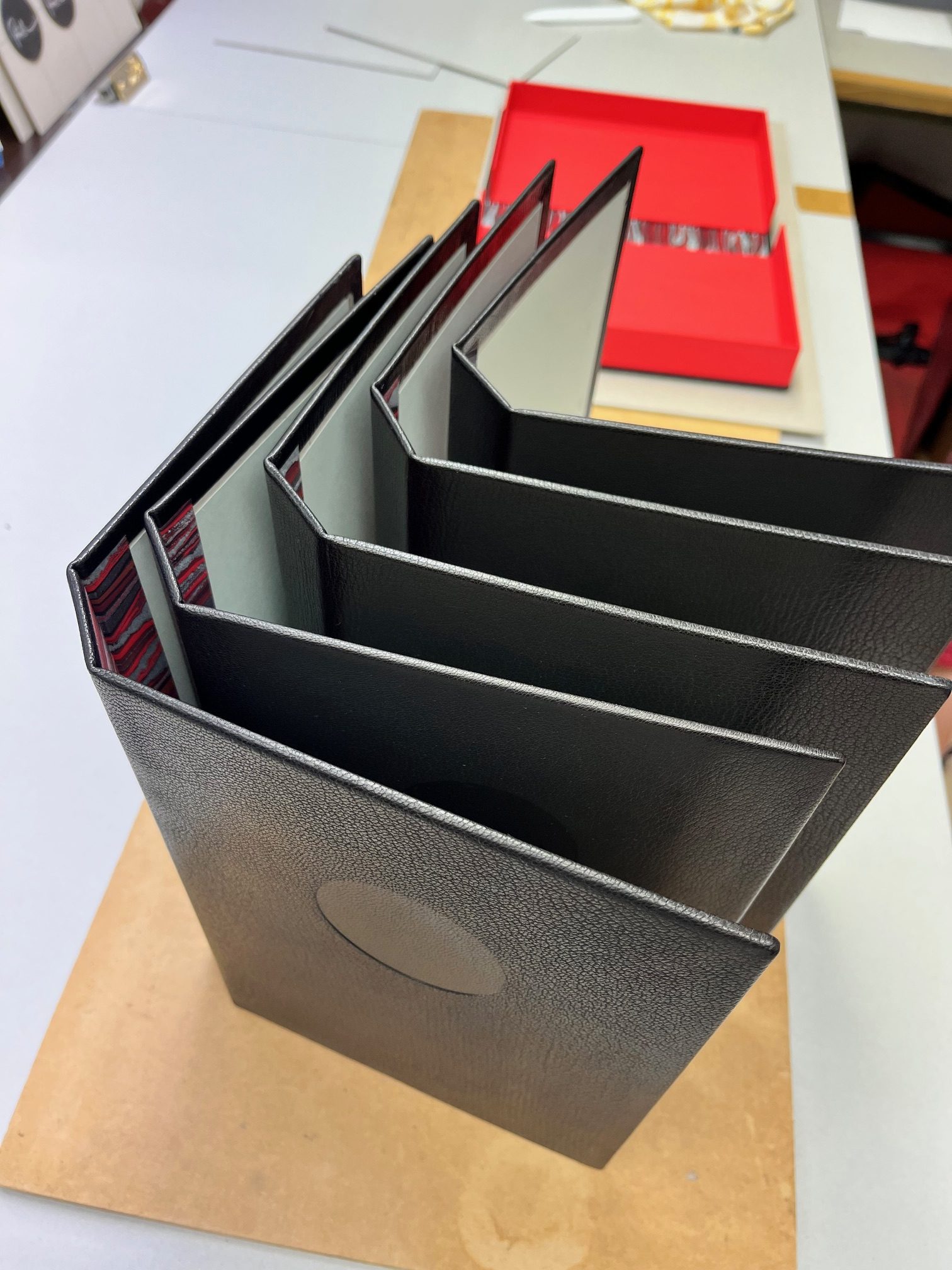 Format 40 cm x 60 cm, dreiteilig, komplett mit Leinen bezogen, Feldvertiefung auf der Vorderseite für Titelschild mit Kalligraphie, 2 Elemente mit großflächiger Kalligraphie, 2 Elemente mit Papierecken für Originale