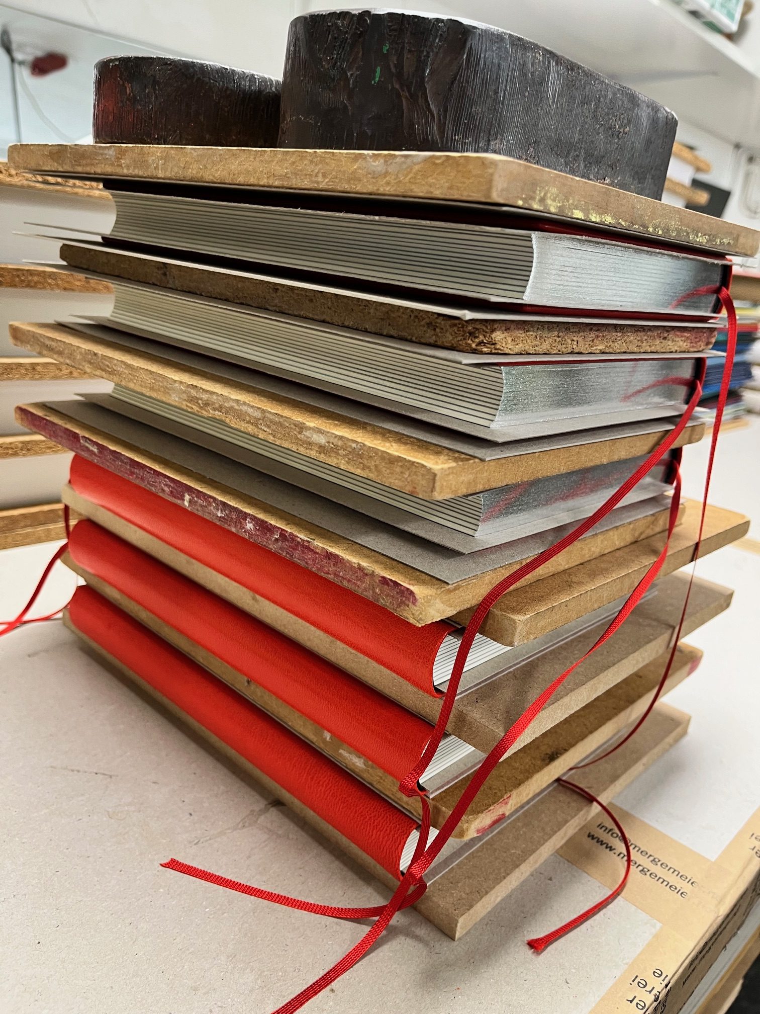 Die Einbände sind aus strapazierfähigem Buckram, eine Bibliotheksqualität, die in vielen Farben möglich ist. Der Buchblock wird in gefächerter Klebebindung hergestellt und erhält eine besondere Rückenfestigung, die bei schweren Bänden die Formstabilität gewährleistet. Wir prägen mit unseren Satzschriften und/oder Klischees in Gold, Silber oder Farbe.